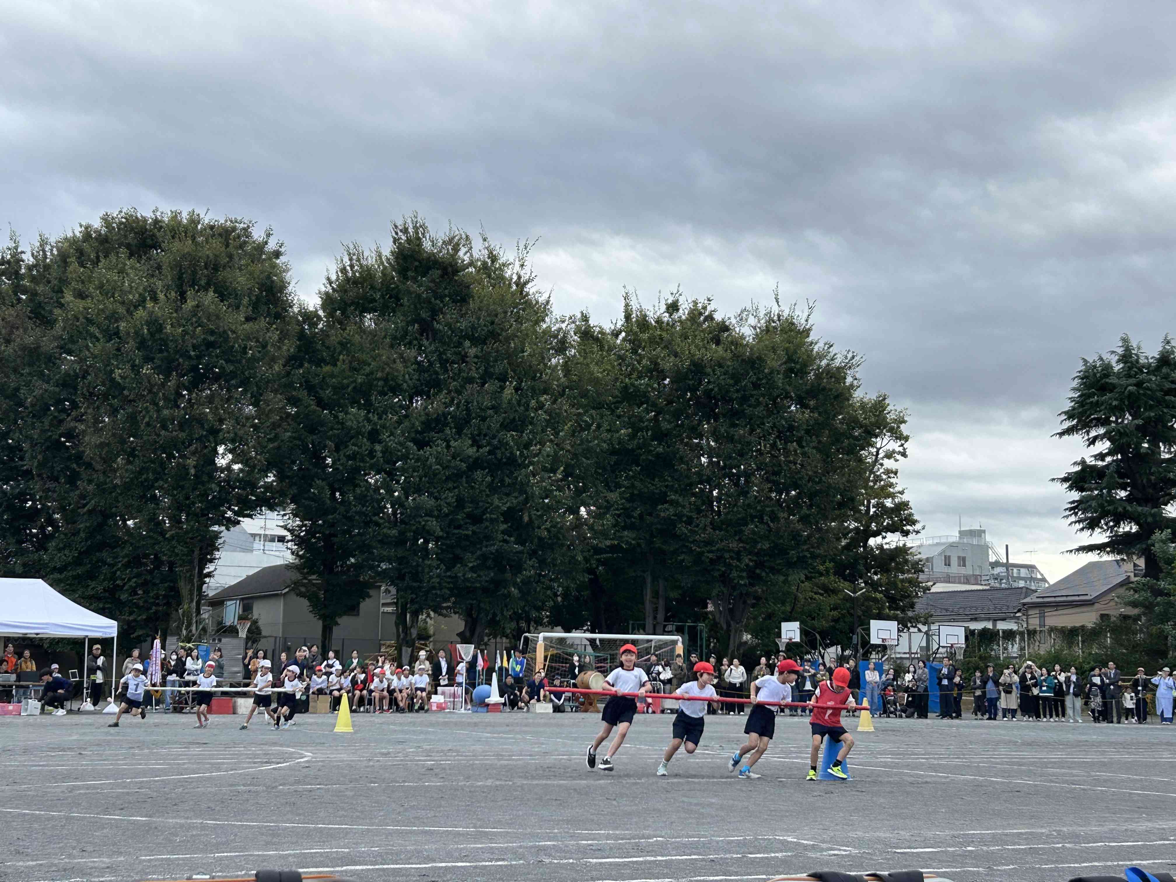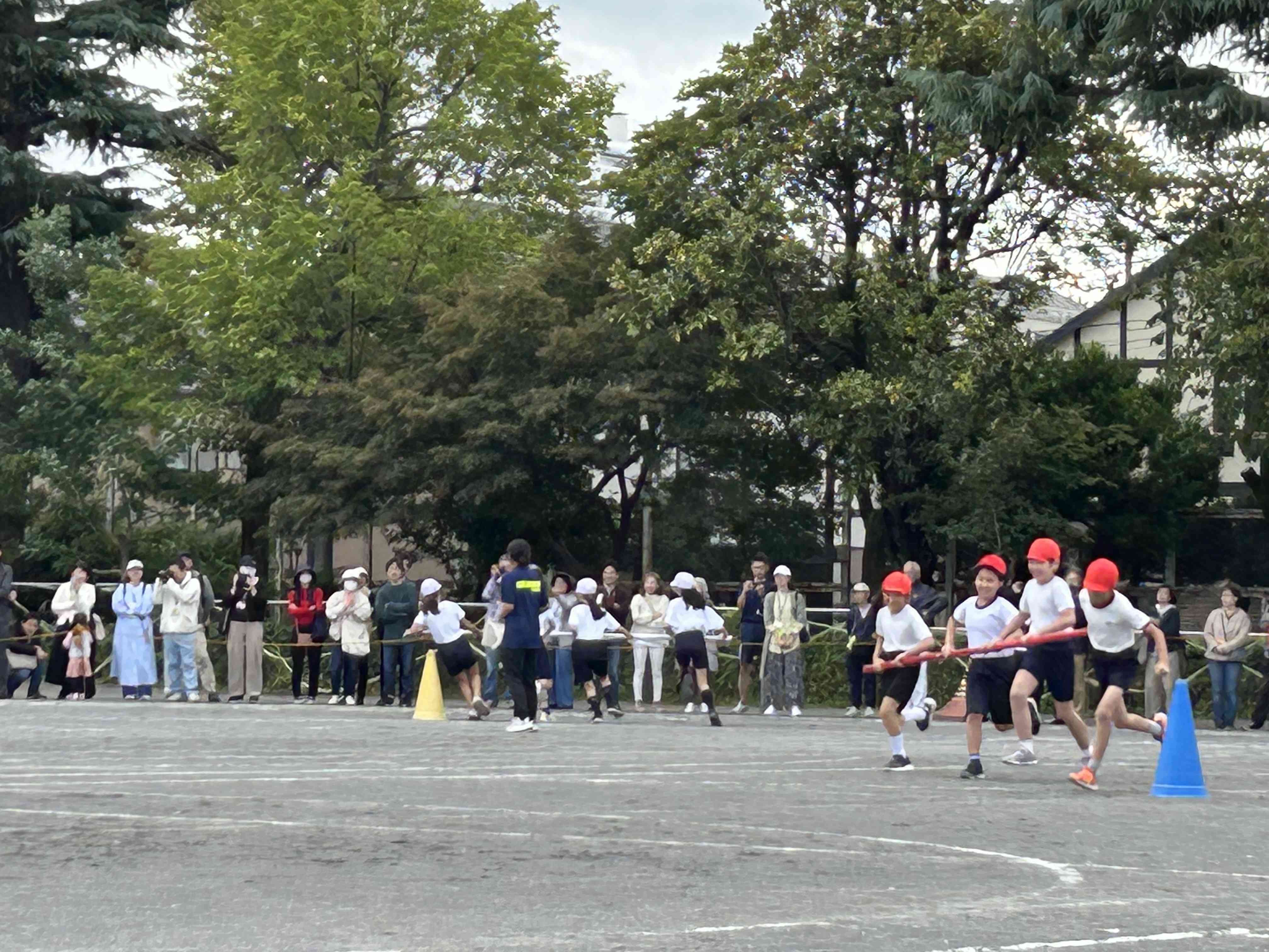 中学年 団体競技「四小ハリケーン!!」 チームごとに長い棒を持って、コーンを回ります。チームワークが光るゲームでした。